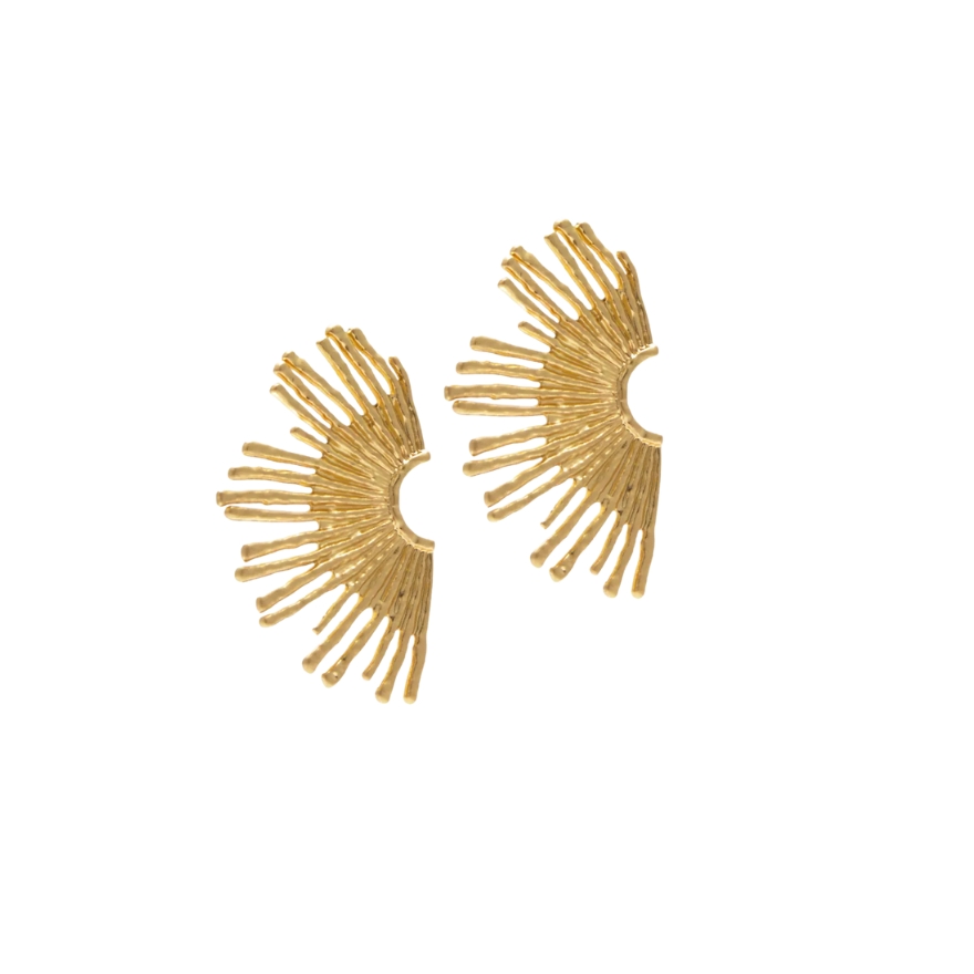 Sunčani motiv zlatnih naušnica s detaljno razrađenim zrakama sunca predstavlja pravi primjer kako chunky nakit može biti istovremeno dramatičan i elegantan. Njihova skulpturalna forma podsjeća na Art Deco period, a pozlaćenost dodaje toplinu jesenskim kombinacijama. Savršene su za casual business look, ali i večernje kombinacije uz all-black outfit.