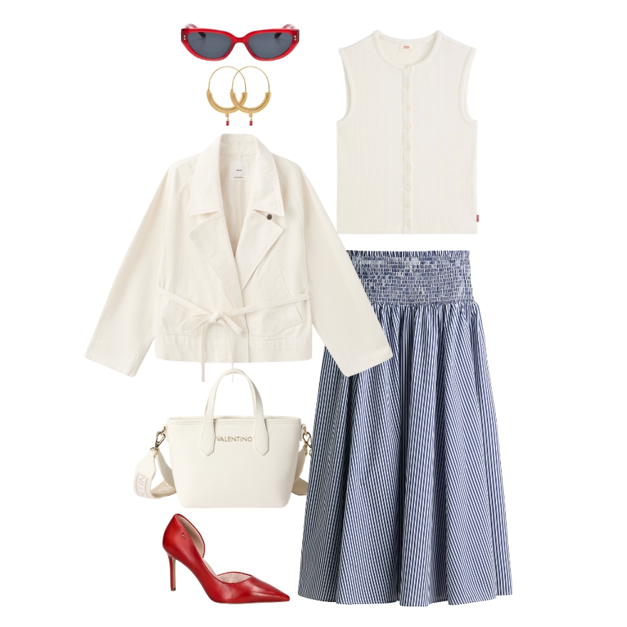 Prvi outfit pokazuje koliko je nijansa Cloud Dancer zahvalna baza za kombiniranje s drugim bojama. Nježni svijetli tonovi kroz jaknu, top i torbu stvaraju smiren, prozračan temelj, dok prugasta suknja i crveni detalji unose dinamiku i razbijaju monotoniju. Upravo taj kontrast čini kombinaciju zanimljivom, ali i dalje vrlo primjenjivom. Svijetli komadi ublažavaju cijeli look, dok akcenti daju dozu karaktera bez da preuzmu glavnu riječ.