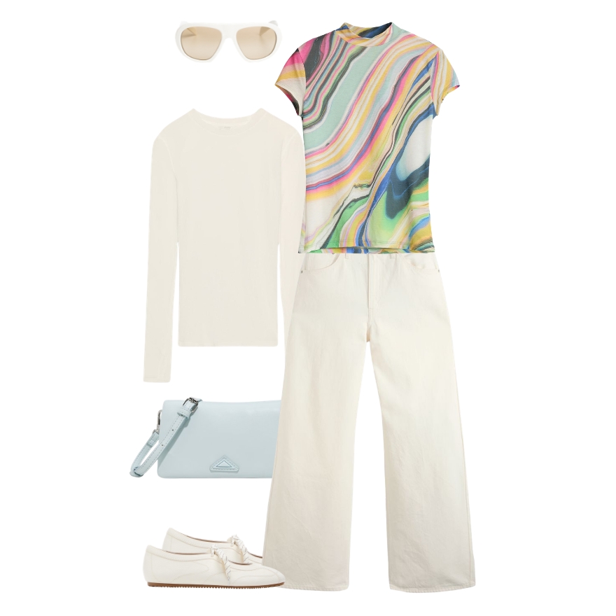 Ovdje Cloud Dancer funkcionira kao idealna neutralna podloga koja smiruje vizualno jači komad poput šarenog topa. Svijetle hlače, torba i sloj dugih rukava stvaraju čist, uravnotežen look, dok print donosi dozu energije i razigranosti. Upravo ta kombinacija čini outfit prikladnim: baza ostaje jednostavna i prilagodljiva, a statement komad dolazi do izražaja bez da outfit djeluje prenapadno.