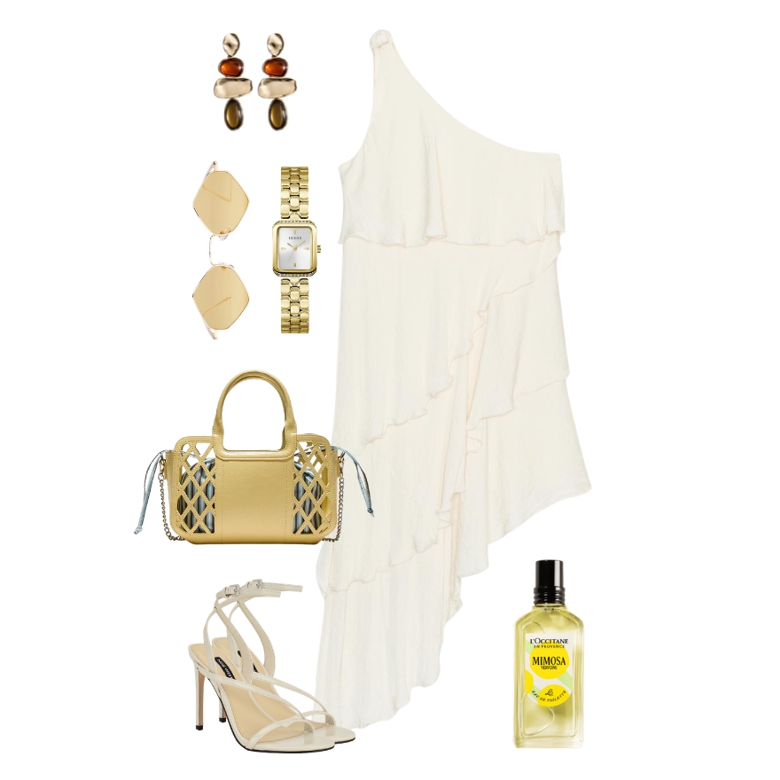 naušnice Mango, 19,99 €; sunčane naočale Nicole Marie, 30 €; sat Guess, Watch Centar, 229 €; haljina Zara, 35,95 €; torba Stradivarius, 25,99 €; cipele Nine West, 85 €; parfem L’Occitane en Provence, 67,70 €