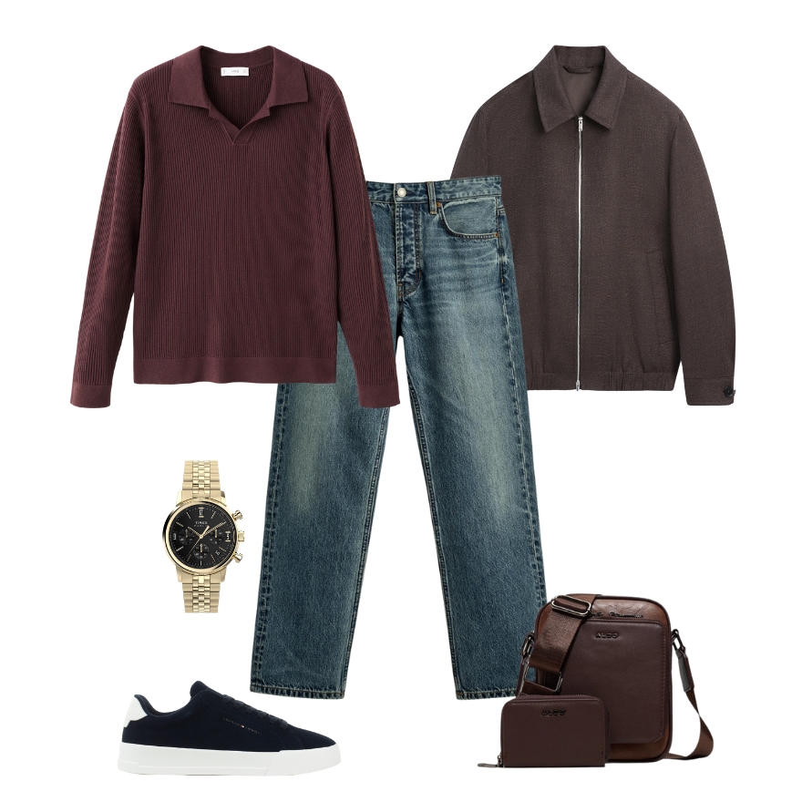 Muški styling ide u smjeru ležerne sofisticiranosti. Jednostavan je, ali s dovoljno karaktera da stoji sam za sebe. Pleteni pulover u dubokoj nijansi vina, koja komplementira bordo tonove u ženskom outfitu, nosi glavnu ulogu. Ravni jeans daje bezvremensku osnovu, dok lagana tamna jakna unosi strukturu zbog koje ju možete nositi u svim prilikama. Dodaci su pažljivo birani: zlatni sat koji unosi mjeru profinjenosti te tamnosmeđa crossbody torbica koja odlično komunicira s toplim, zemljanim tonovima kompleta. Čiste, moderne tenisice smiruju kombinaciju i dodaju sportsku, nenametljivu notu.