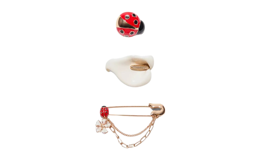 Razigran set triju broševa spaja humor, nostalgiju i suvremenu estetiku: točno ono što obilježava trendove nakita u 2026. godini. Bubamara u intenzivnoj crvenoj boji unosi dozu sreće i šarma, školjkasti broš daje prirodnu, organsku eleganciju, dok sigurnosna igla ukrašena lancima i privjescima dodaje moderni punk twist. Nosite ih pojedinačno za suptilan naglasak ili zajedno kako biste svaku jaknu, kaput ili torbu pretvorili u komad s pričom i osobnošću.
