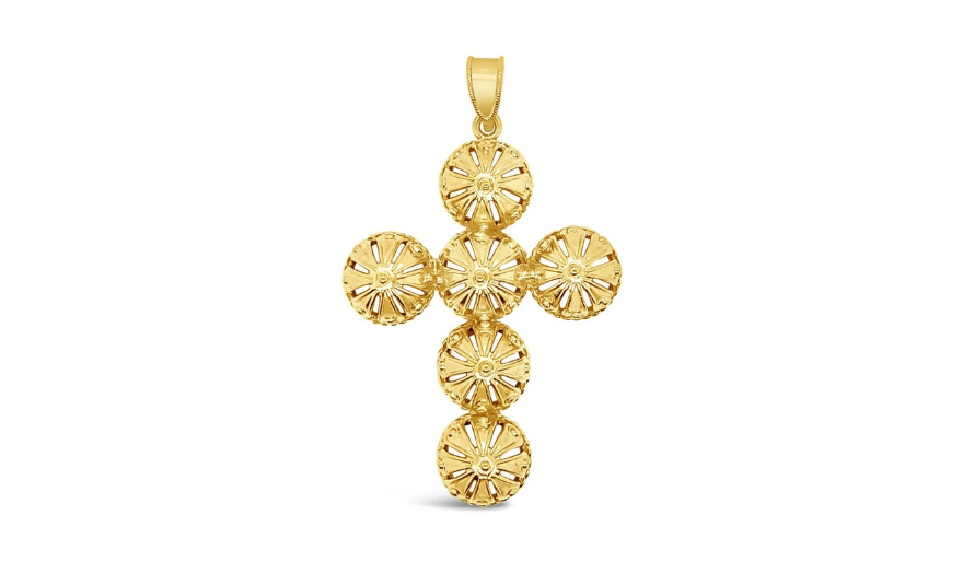Privjesak koji donosi snažan vizualni dojam, ali zadržava profinjenost istaknut će se među ključnim trendovima za 2026. Sastavljen od niza bogato teksturiranih zlatnih elemenata koji zajedno formiraju simbol križa, ovaj komad uspijeva spojiti tradiciju i suvremenu estetiku. Efektan je dovoljno da bude središnja točka svakog stylinga, bilo da ga nosite uz jednostavan lančić za svakodnevne kombinacije ili uz statement ogrlicu kada želite dodatnu dozu glamura.