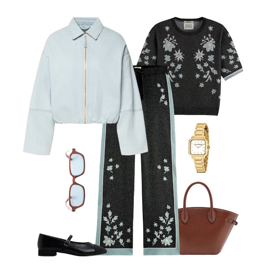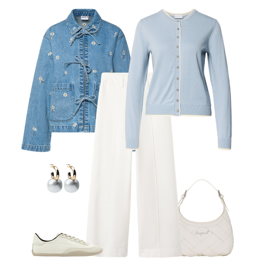 Nježna ice blue nijansa ovdje dolazi do izražaja kroz klasični kardigan koji cijelom outfitu daje svjež i profinjen ton. U kombinaciji s bijelim širokim hlačama stvara se lagan, prozračan look koji je idealan za proljetne dane. Traper jakna s diskretnim cvjetnim detaljima dodaje dozu razigranosti i teksture, dok bijele tenisice zadržavaju opušten i svakodnevan karakter kombinacije. Torba u svijetloj nijansi i minimalističke naušnice zaokružuju outfit koji djeluje elegantno, ali i dovoljno ležerno za dnevne obaveze.