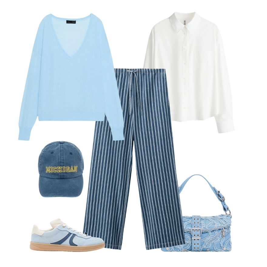 Ovaj outfit pokazuje koliko ice blue nijansa odgovara opuštenim, svakodnevnim kombinacijama. Lagani pulover u svijetloplavoj boji donosi svježinu i lakoću, dok prugaste hlače daju dozu ležerne strukture cijelom looku. Bijela košulja slojevito upotpunjuje kombinaciju i dodaje joj uredniji ton, dok tenisice i šilterica zadržavaju opušten, urbani karakter. Torba u istoj pastelnoj nijansi povezuje cijelu paletu i čini ovaj outfit idealnim izborom za proljetne dane u pokretu.
