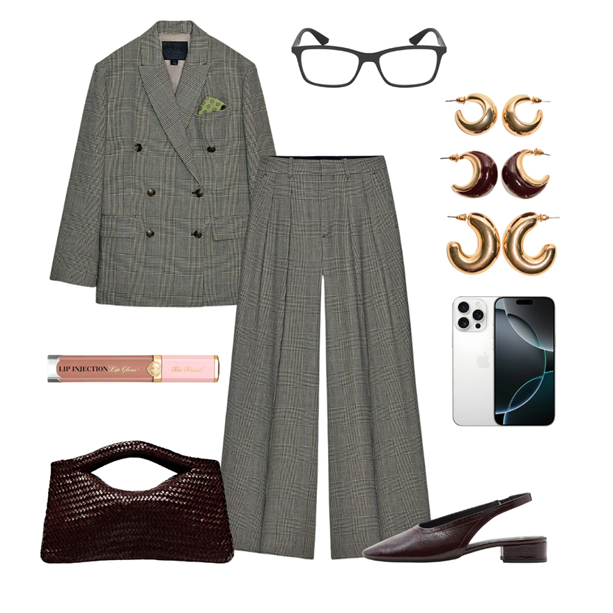 Kombinacija donosi modernu interpretaciju klasičnog poslovnog looka. Sivo karirano odijelo odiše snagom i samopouzdanjem, baš onako kako Shay voli. Pletena smeđa torba i slingback cipele u toplom tonu omekšavaju strogu siluetu, dok zlatne naušnice dodaju notu glamura. Rezultat? Look koji je istovremeno moćan i elegantan, savršen za poslovne prilike, ali i after-work druženja.