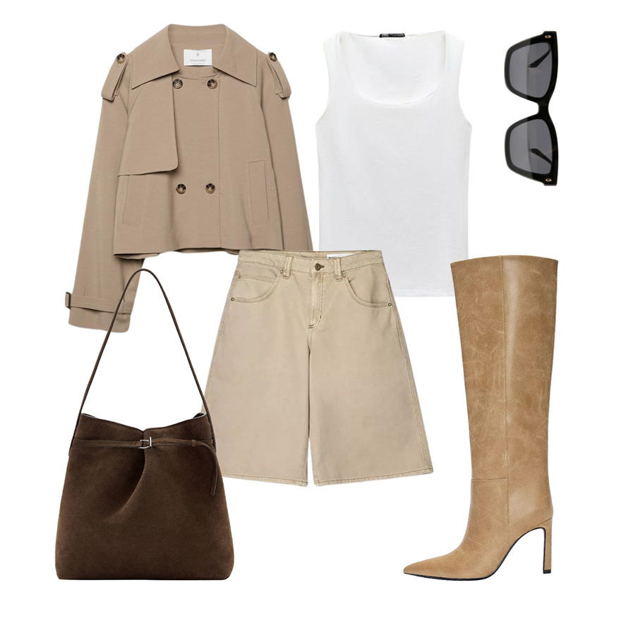 Za one dane kada želite izgledati chic bez previše truda, tu je kratki bež trench preko bijelog topa i bež traper hlače do koljena, uz visoke smeđe čizme. To je kombinacija koja spaja praktičnost i stil, idealna za prijelazno razdoblje i urbane šetnje. Neutralna paleta i jednostavne linije čine ovaj outfit bezvremenski, dok svaki detalj odiše sofisticiranom lakoćom tipičnom za lookove poznate glumice.