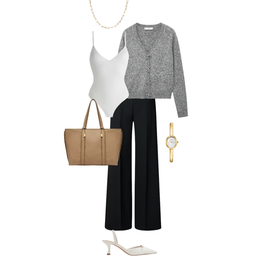 Sivi kardigan preko bijele majice uz široke crne hlače u stilu 70-ih stvara opuštenu profesionalnost. Ovaj look je savršen za business casual dresscode ili važne prezentacije gdje trebate izgledati poslovno, ali pristupačno. Nude pete i zlatni detalji dodaju touch glamura koji podiže cijelu kombinaciju.