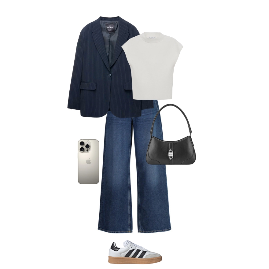 Navy sako s trapericama pokazuje kako i ovaj komad može biti casual. Outfit je idealan za casual Friday u kreativnim industrijama ili vikend shopping s prijateljicama. Bijele tenisice s crnim detaljima drže sve u opuštenom, ali stylish tonu.