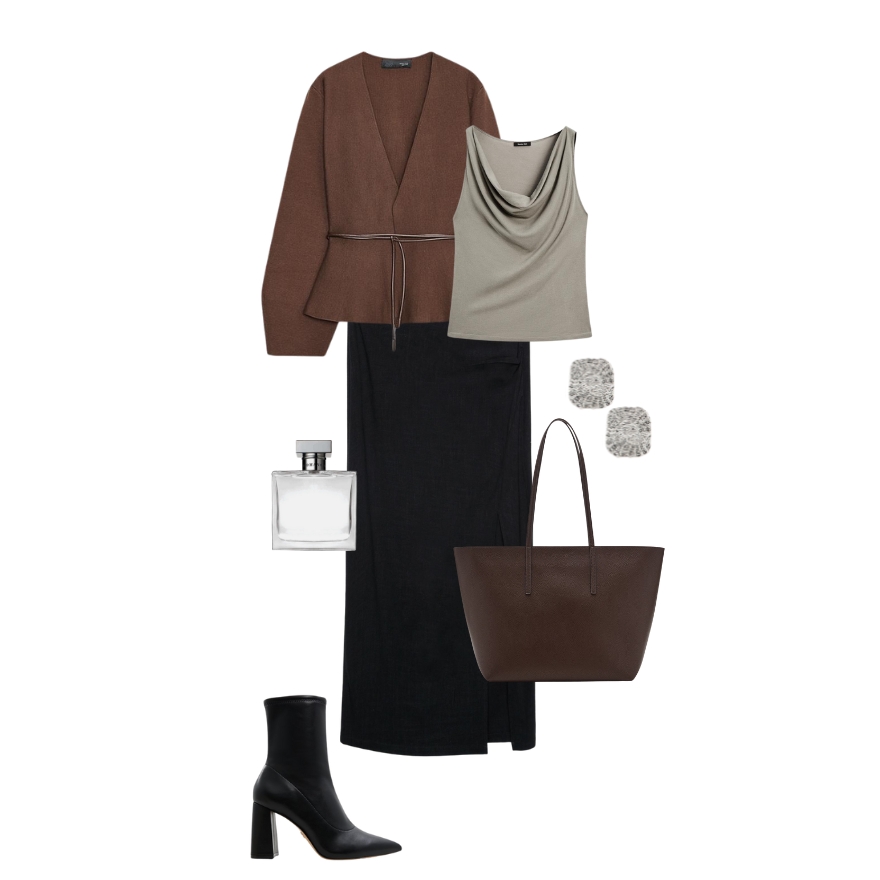 Smeđi wrap kardigan s crnom suknjom kreira sofisticiran večernji look i pravi je dokaz da ovaj komad nije rezerviran samo za dnevne kombinacije. Ova kombinacija je idealna za date-night ili kulturna događanja gdje želite istovremenu udobnost i glamur. Crne gležnjače i teksturirane naušnice prekrasno završavaju ovu kombinaciju.