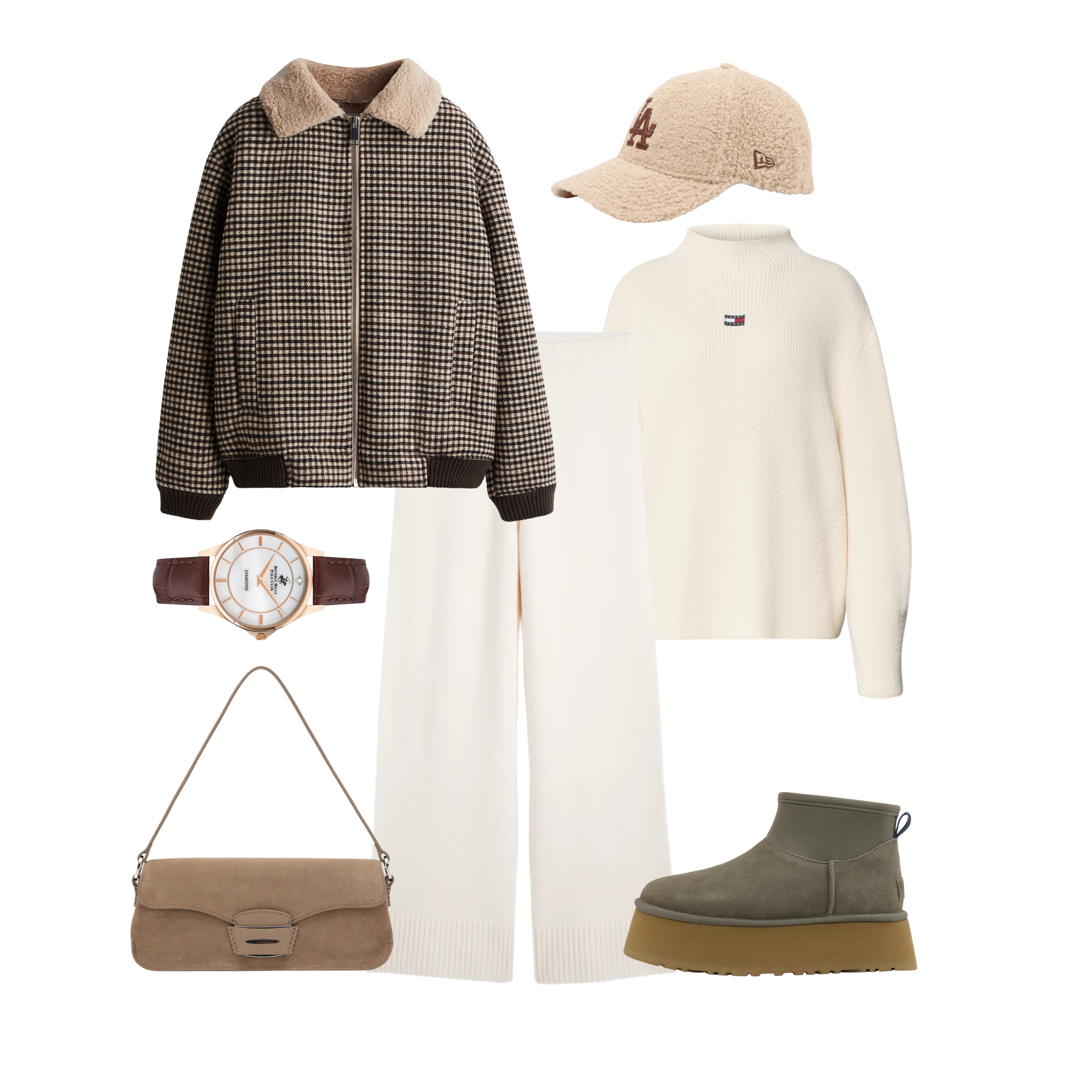 Prvi look je definicija „quiet luxury“ stila. Karirani bomber sa sherpa ovratnikom susreće krem dolčevitu i široke pletene hlače, stvarajući look koji diše lakoćom i profinjenošću. Platforme dodaju suvremeni streetwear twist, dok bež torba i minimalistički sat daju notu bezvremenske elegancije. To je kombinacija za žene koje vole izgledati effortless, ali uvijek odabrano – savršena za kavu u gradskom kafiću, jutarnju šetnju ili spontan shopping. Ne vrišti za pažnjom, ali ju svakako dobiva.