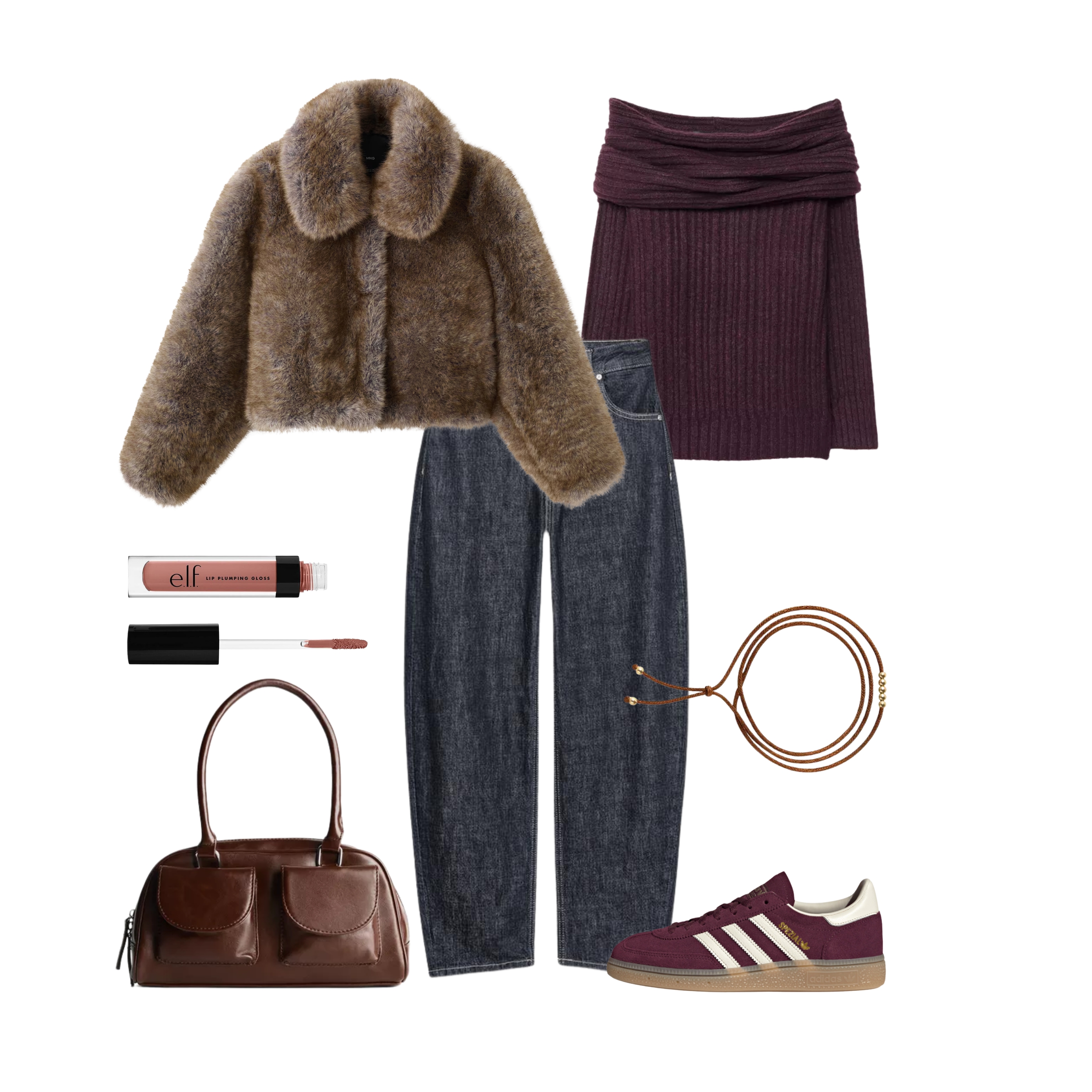 Drugi look spaja ono što je nekad bilo nespojivo – sportski duh i senzualnost tekstura. Kratka smeđa teddy jakna kombinira se s trapericama visokog struka i burgundskim Adidas tenisicama, dok su detalji poput smeđe torbe i suptilnog ruža u boji karamele točka na „i“.