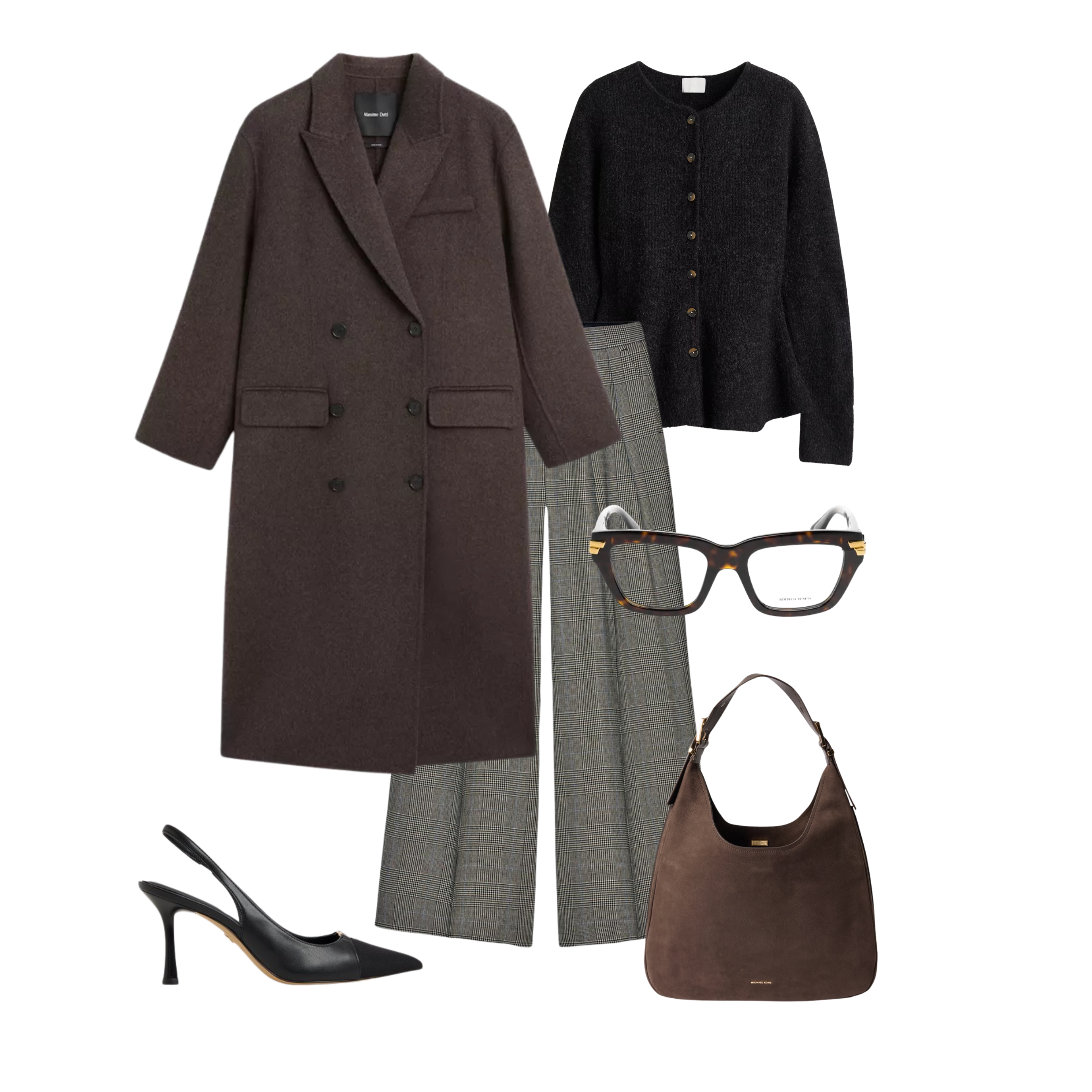 Klasični smeđi kaput, karirane hlače i crna pletena kardigan bluza stvaraju sofisticiranu bazu, dok dodatci poput strukturirane torbe i elegantnih slingback cipela unose dozu femme power energije. Ovo je modna formula za uredske dane kad želite izgledati kao da imate sve pod kontrolom – ali i kao da vas ne dotiče hladnoća vani. To je kombinacija samopouzdanja i mekoće, poslovnog uma i cozy duše.