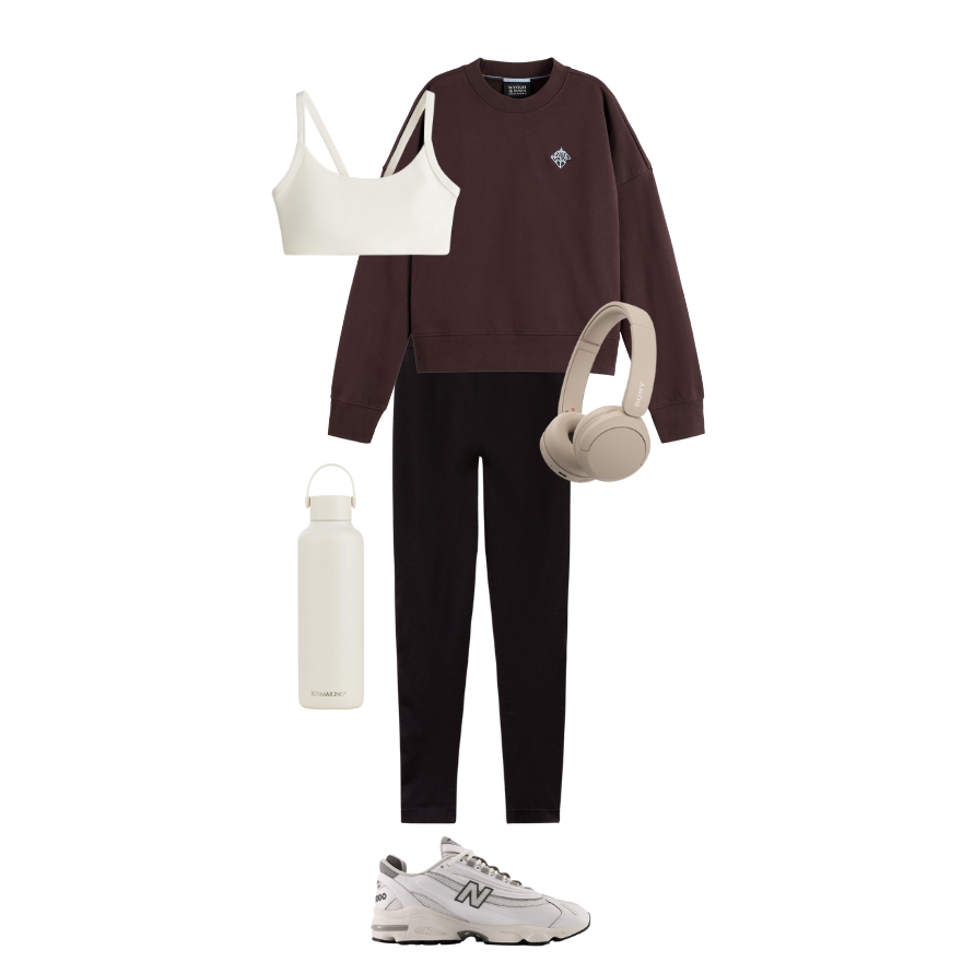 Tamno smeđi sportski pulover s neutralnim detaljima donosi autumn vibes u teretanu. Ova ugodna kombinacija savršena je kad se polako vraćamo u rutinu, a slojevi omogućavaju prilagođavanje temperaturi tijekom treninga.