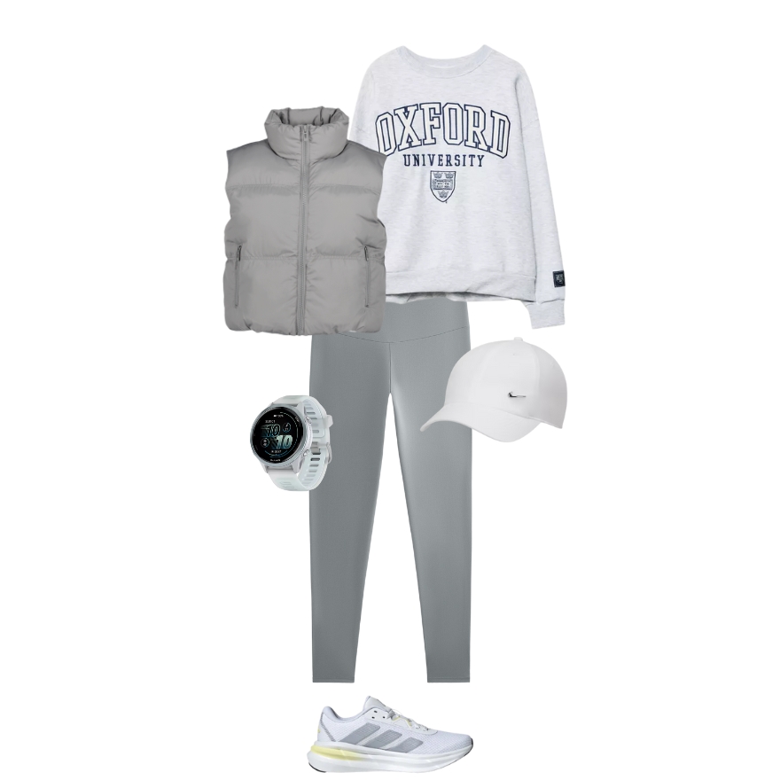 Sivi puffer prsluk preko sveučilišne hoodice miješa akademsku jesensku energiju sa sportskim duhom. Idealan za one koji teretanu tretiraju kao produžetak studija – fokusirano, ciljano, s dozom intelektualne superiornosti ili one koji vole vježbati rano ujutro na svježem zraku.