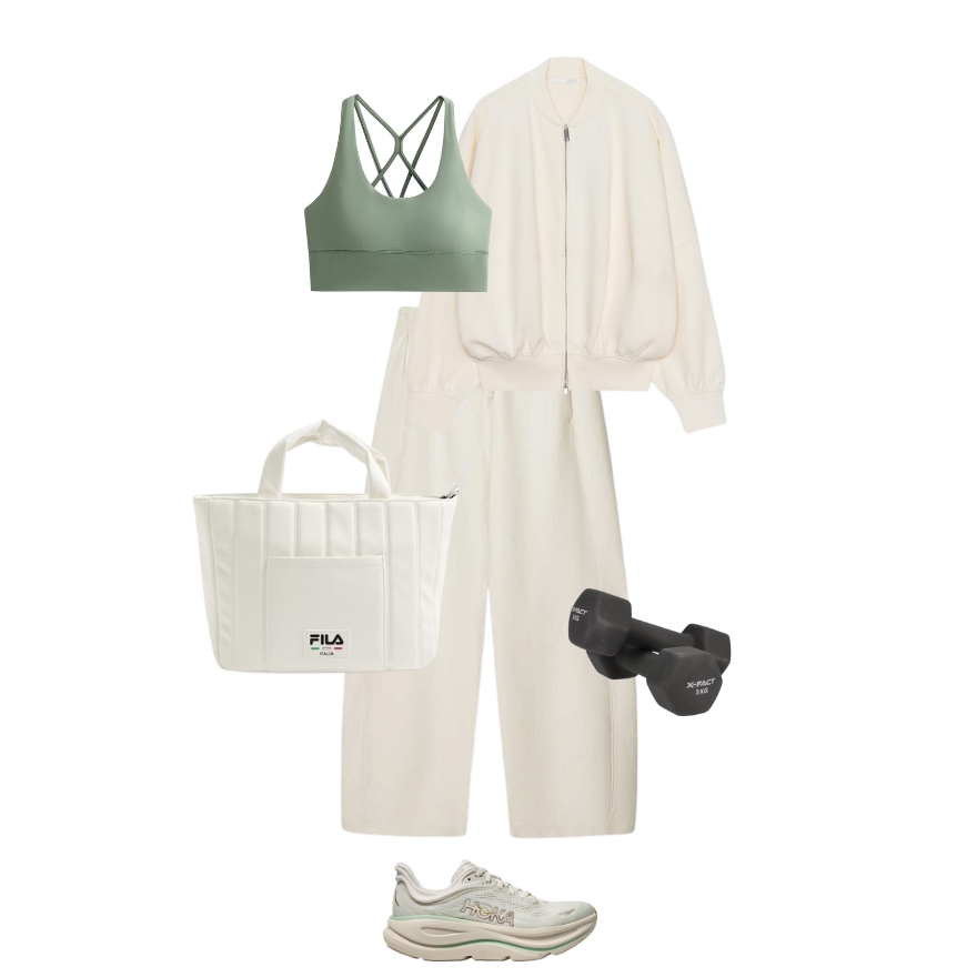 sportski grudnjak Oysho, 22,99 €; torba Fila, Deichmann, 29,99 €; tenisice Hoka, Intersport, 179,99 €; utezi X Fact, Hervis, 29,99 €; gornji dio trenirke Zara, 25,95 €; hlače Bershka, 25,99 €
