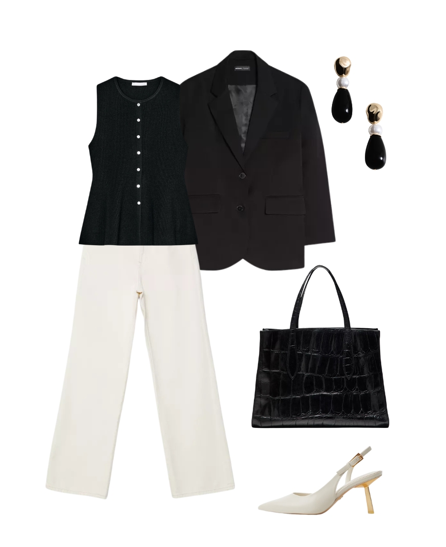 Elegantno uravnotežen između minimalizma i preppy estetike, ovaj outfit igra na sigurnu kartu kontrasta: čista bijela i duboka crna uvijek su dobitna kombinacija za gradske dane. Strukturirani blejzer dodaje strogoću i formu, dok top bez rukava unosi mekoću i ženstvenost. Šire bijele hlače unose dašak suvremene ležernosti, a krokodilski efekt na torbi daje outfitu luksuznu teksturu. Uz diskretno profinjene naušnice i bijele slingback sandale, ovaj look postaje idealan odgovor na one dane kada trebate biti elegantne, ali bez kompromisa na udobnosti.