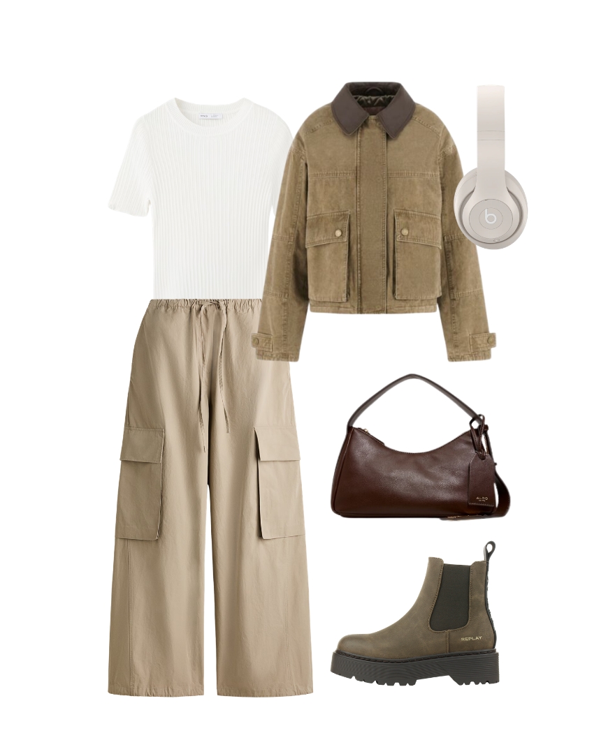 U danima kada gradski ritam traži praktičnost, ali ne dopušta odustajanje od stila, ovakav „utility meets chic“ spoj postaje idealan izbor. Lagana rebrasta majica služi kao jednostavna, ali efektna baza, dok cargo hlače širokog kroja unose modernu funkcionalnost. Kratka jakna u toplom, zemljanom tonu nadovezuje se na trend praktičnih silueta, a gležnjače s debljim đonom dodaju dozu robusne elegancije. Tamnosmeđa torba zaokružuje paletu i unosi sofisticiranu notu, dok slušalice daju outfitu suvremeni, urban touch. Ovaj look savršen je za proljetne dane u pokretu.
