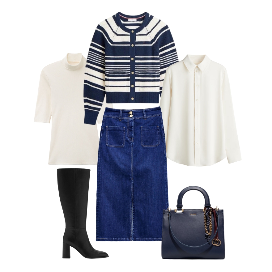 Prvi outfit spaja udobne klasike u formulu koja savršeno ističe visoke, elegantne čizme. Midi traper suknja daje modernu siluetu, dok kombinacija neutralne dolčevite i lagane košulje stvara profinjenu osnovu za slojevito odijevanje. Prugasti kardigan unosi malo francuskog šarma i razbija jednostavnost teksturama i uzorkom. Uz strukturiranu torbu u tamnoplavom tonu i visoke čizme koje vizualno izdužuju figuru, dobivate outfit idealan za grad, posao ili vikend šetnju: klasičan, praktičan i uvijek stilski dotjeran.