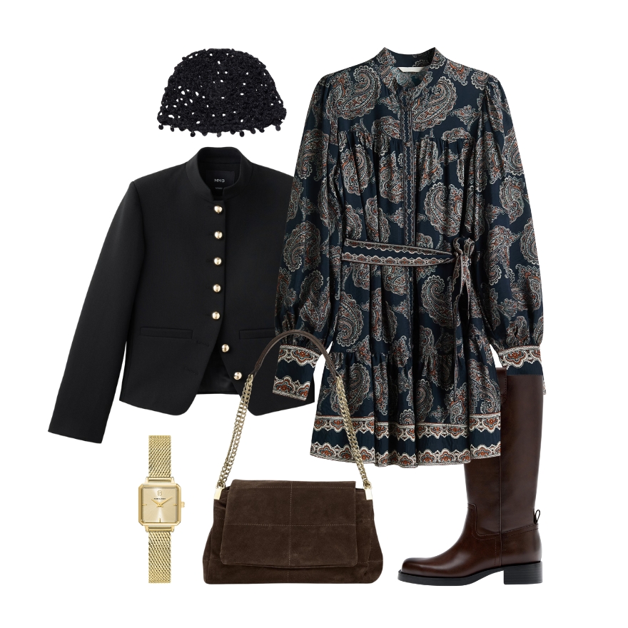 Romantični boho štih u kombinaciji s modernim gradskim elementima stvara idealnu kombinaciju uz smeđe kožne čizme. Lepršava haljina s paisley uzorkom daje dinamiku i mekoću, dok strukturirani blejzer s dekorativnim gumbima unosi dozu elegancije i definira siluetu. Pletena kapa dodaje trendovski, pomalo artsy touch, a torba od antilopa povezuje cijeli styling toplim, zemljanim tonovima. Uz zlatni sat koji naglašava sofisticiranu stranu looka, dobivate outfit koji lako prelazi iz dnevnih u večernje planove. Krajnji rezultat je chic, razigran i nosiv u svakoj prilici.