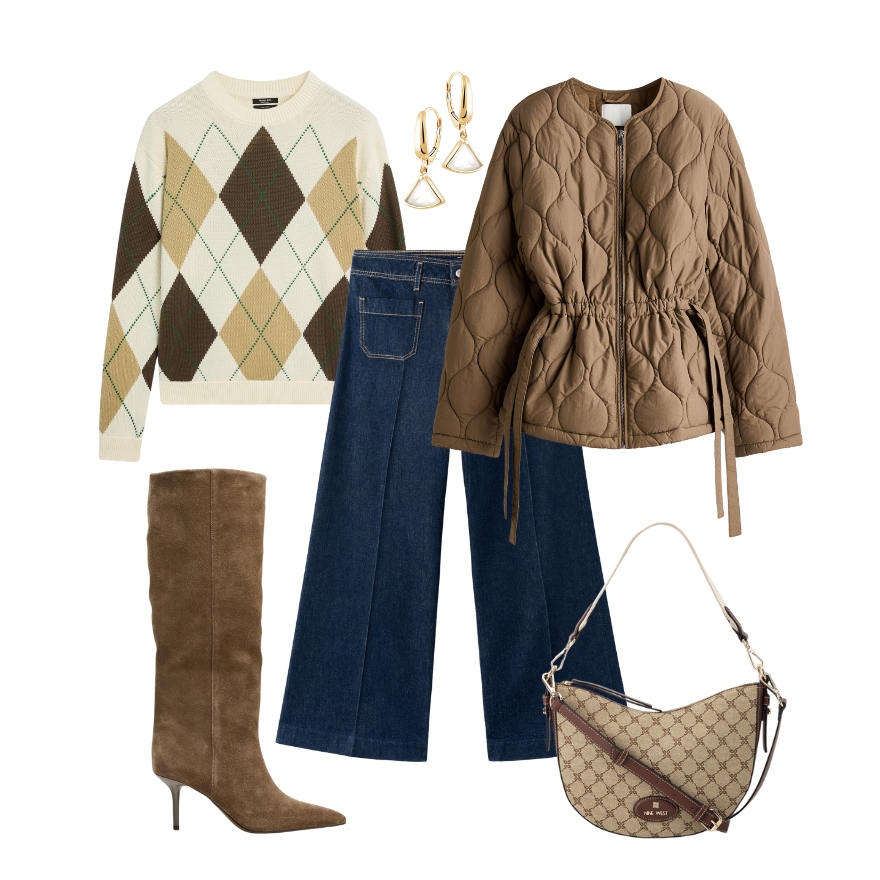 Suvremena interpretacija zimske klasike je idealna formula za visoke antilop čizme u toploj smeđoj nijansi. Argyle pulover donosi nostalgičan, gotovo akademski prizvuk, dok široke traperice daju outfitu ležernu ravnotežu i suvremen volumen. Quilted jakna u karamel tonu unosi teksturu i praktičnost, a profinjena torba s monogram uzorkom zaokružuje paletu i dodaje dozu luksuza. Uz statement naušnice koje unose mali bljesak glamura, dobivate chic dnevni outfit koji je udoban, slojevit i trendovski bez previše truda.