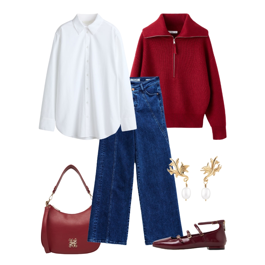 Ovaj outfit kombinira bijelu košulju s trapericama i toplim puloverom za savršen balans između udobnosti i dotjeranosti. Ovo je vaš go-to za božićne shopping maratone, casual obiteljska okupljanja i sve one dnevne blagdanske aktivnosti gdje želite izgledati stylish, ali ne kao da ste pretjerali. Elegantne balerinke i struktuirana torba dižu casual denim na sofisticiraniju razinu.