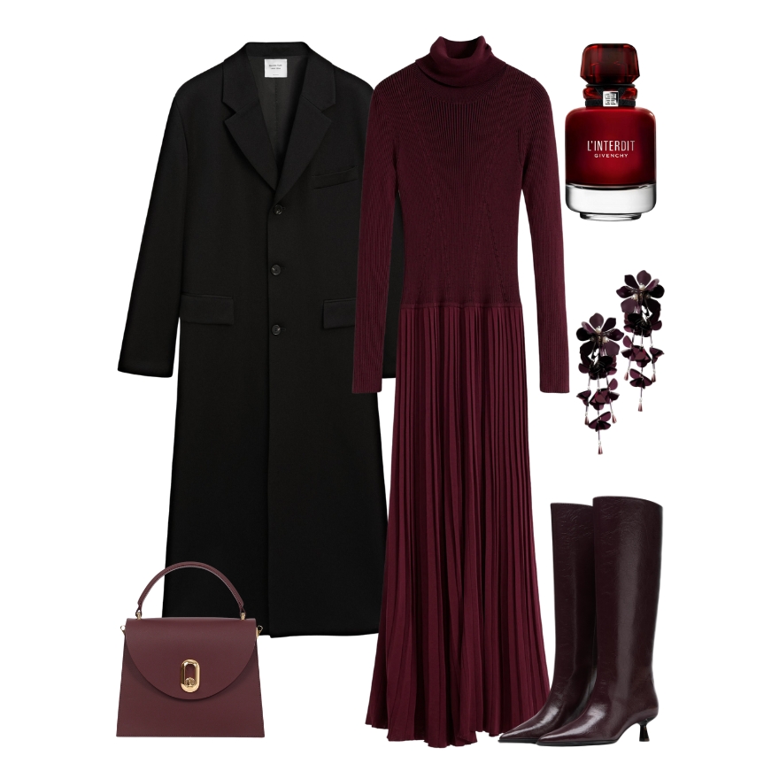 kaput Massimo Dutti, 349,00 €; torba Mona, 230,00 €; haljina Desigual, 107,40 €; parfem Givenchy, Douglas, 122,49 €; naušnice Mango, 22,99 €; čizme Stradivarius, 49,99 €