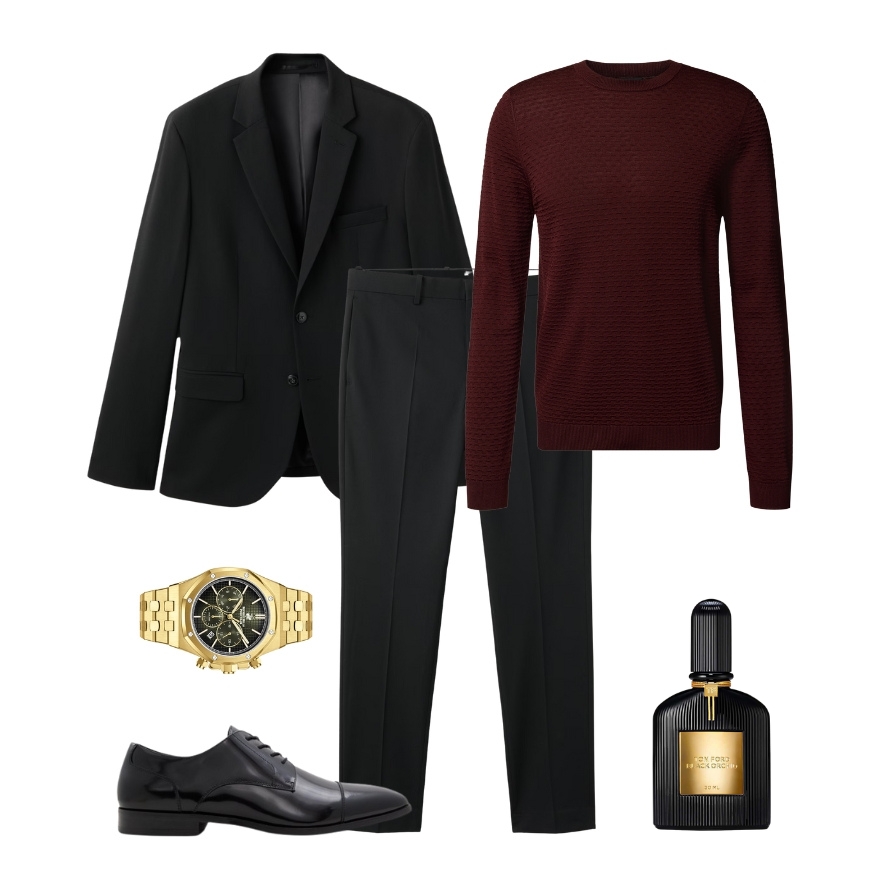 Strukturirano crno odijelo s toplim puloverom, savršen je odabir za poslovne božićne domjenke i elegantnije prilike. Ovaj outfit dokaz je da možete biti festive bez tipičnih blagdanskih pravila: dobar kroj i pametni komadi koje možete iskoristiti i za druge prigode rade sav posao. Kvalitetni detalji poput sata i kožnih cipela potvrđuju polished pristup.