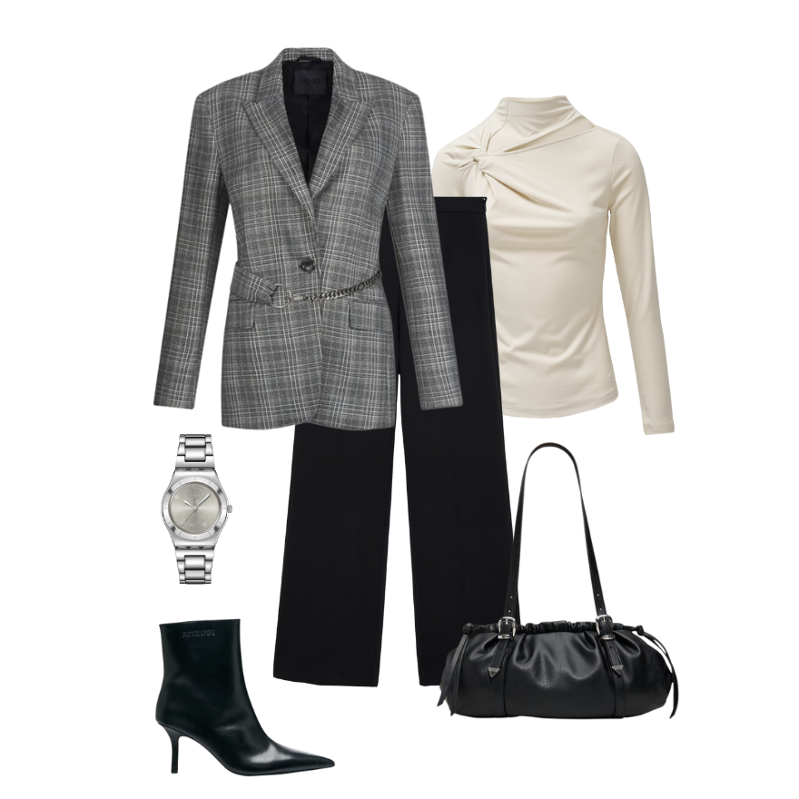 Kombinacija donosi karirani sako u tonovima maglovite sive, spojem s krem dolčevitom i crnim hlačama stvara pamtljiv, a jednostavan look. Kitten heel čizme i srebrni sat diskretno podižu cijelu priču, pretvarajući poslovni outfit u modnu izjavu.
