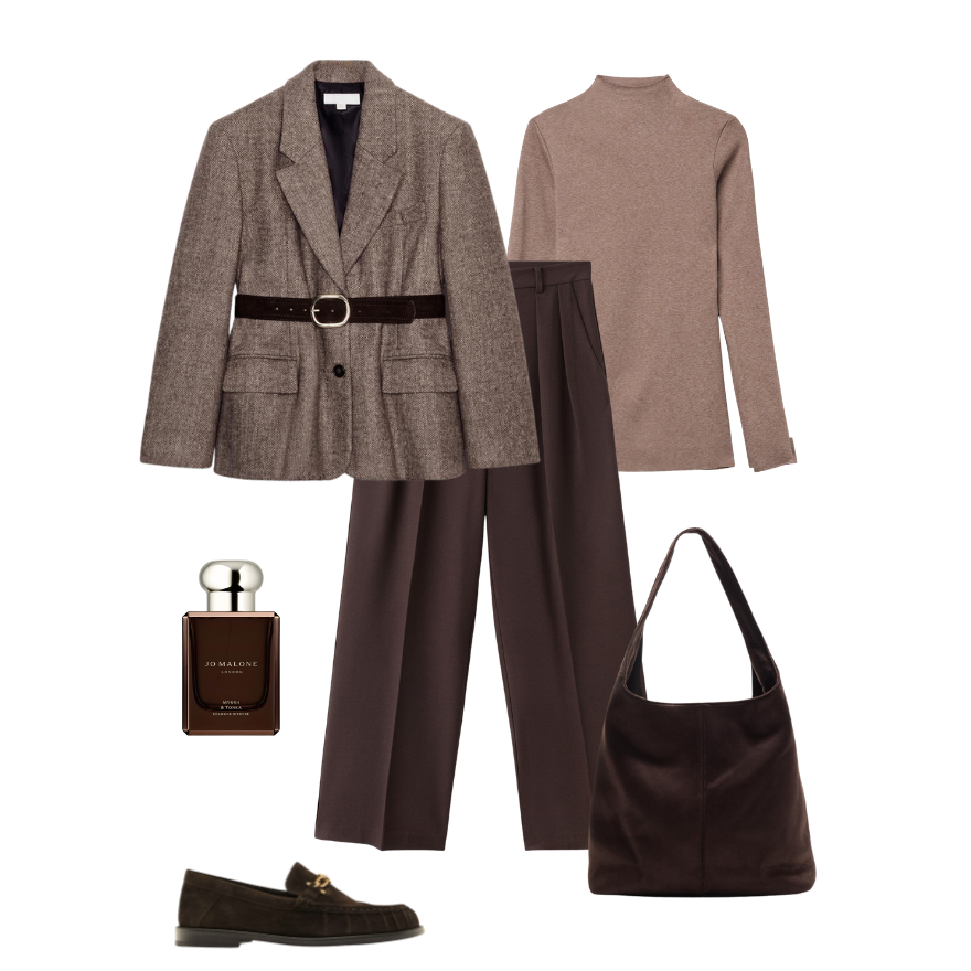 Outfit koji miriše na jesenske šetnje po gradu. Smeđi sako s remenom, bež pulover i tamno smeđe hlače stvaraju topli tonalni sklad. Cipele daju dašak preppy šarma, a velika kožna torba upotpunjuje viziju žene koja s lakoćom balansira između poslovnog i osobnog svijeta.
