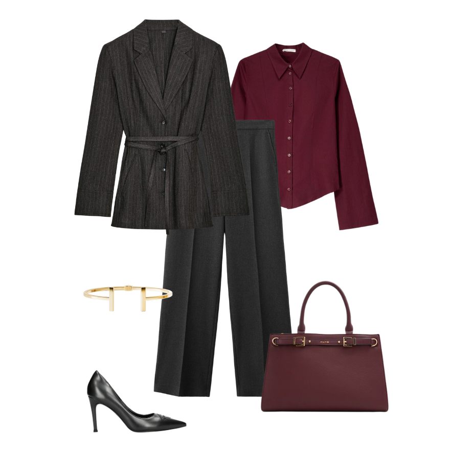Za one koje preferiraju snažniji vizualni dojam, tu je kombinacija antracita s bordo akcentima – boje koje prizivaju luksuz i samouvjerenost. Strukturirana torba i zlatni detalji daju dozu glamura, dok klasične salonke zadržavaju profesionalni okvir.