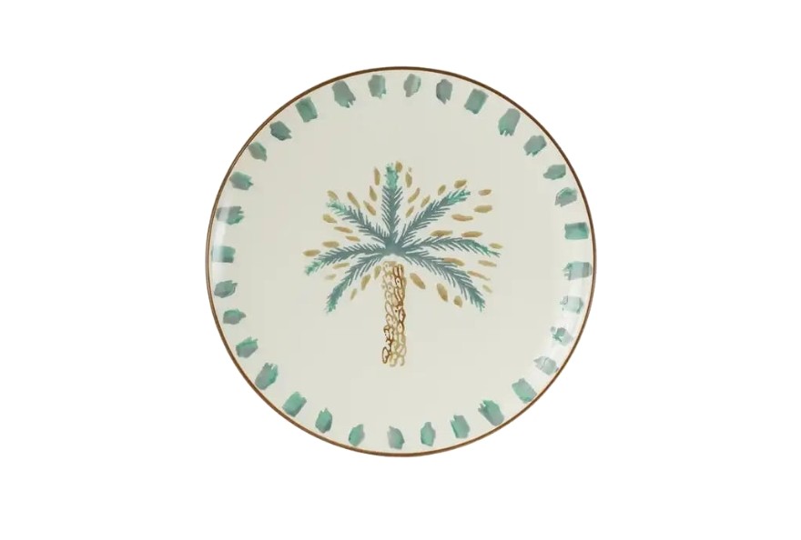 Dekorativni tanjur s ilustracijom palme unosi dašak ležerne, mediteranske atmosfere u interijer. Kombinacija svijetle podloge, zelenih detalja i suptilnog zlatnog ruba djeluje elegantno, ali istovremeno razigrano, što ga čini idealnim dodatkom za proljetno osvježenje doma. Može poslužiti kao zanimljiv akcent na stolu, polici ili komodi, a dobro funkcionira i kao zidni dekor u prostoru kojem želite dodati malo karaktera.
