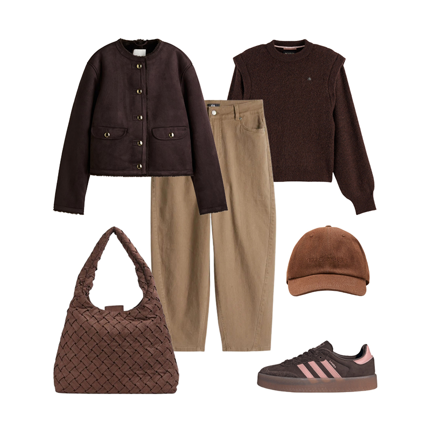 Kombinacija donosi savršenu viziju casual šarma. Wide-leg bež traperice, topli smeđi pleteni džemper i tamnosmeđa jakna od brušene kože stvaraju skladnu igru tonova koja odiše udobnošću i stilom. Pletena torba i baseball kapa unose notu laid-back elegancije, idealnu za opuštene gradske šetnje ili vikend druženja. Tenisice s nježnim ružičastim detaljima unose dašak modernosti u ovu kombinaciju toplih tonova.