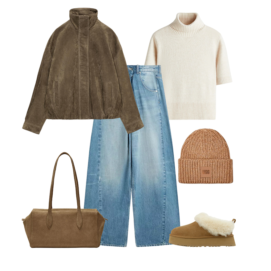 Susreću se dva klasika: denim i antilop. Maslinasta bomber jakna od suedea nosi se preko bijelog pulovera i širokih svijetlih traperica, stvarajući savršen balans između cozy i cool. Papuče i pletena kapa pojačavaju zimsku udobnost, dok torba u kamel nijansi unosi dašak elegancije. Ovaj outfit idealan je za ležerne poslovne susrete ili brunch u urbanoj atmosferi.
