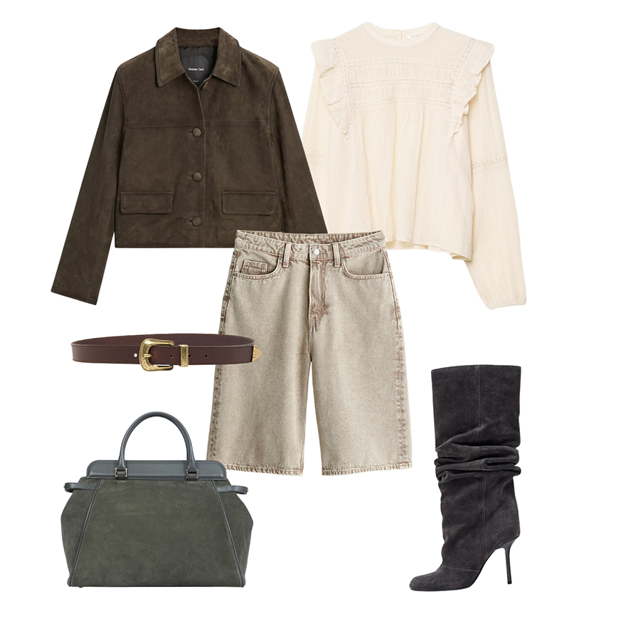 Za one koji vole urbani glam ovaj look donosi savršenu dozu sofisticiranosti. Tamnosmeđa suede jakna kombinira se s kremastom bluzom s volanima i bermudama u neutralnoj nijansi, dok crne slouchy čizme s petom dodaju dozu drame. Siva shopper torba i kožni remen u toploj smeđoj nijansi zaokružuju look koji bez problema prelazi iz poslovnog dana u večernji izlazak.