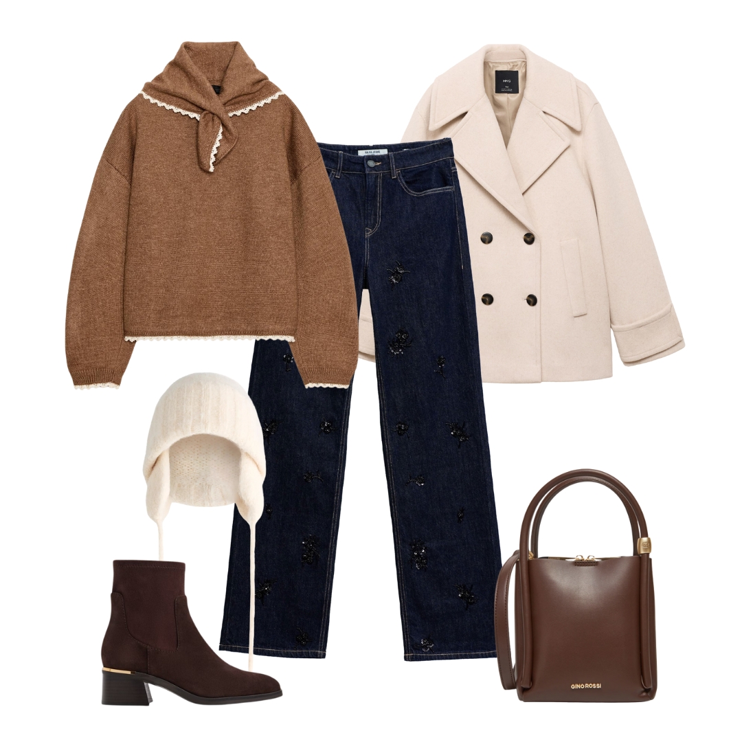 Smeđa oversized pletena majica s nježnim bijelim detaljima, uparena s tamnim trapericama ukrašenim šljokicama i krem peacoat kaputom, donosi onu effortless dnevnu sofisticiranost koju obožavamo. Neutralna paleta, naglašena toplim smeđim tonovima, dobiva neočekivani glam twist zahvaljujući sjaju šljokica. Bijela kapica i smeđe gležnjače diskretno zaokružuju styling u smjeru laid-back luksuza — idealno za jutarnju kavu na Adventu, nezahtjevan shopping ili gradske rituale.
