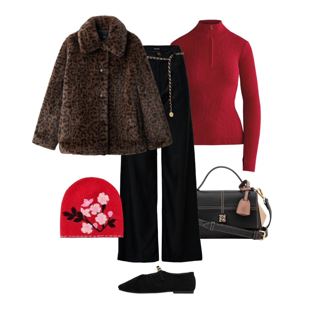 Leopard krznena jakna preko vatreno crvene rebraste dolčevite i crnih širokih hlača ukrašenih lančanim detaljima definira zimsku estetiku koja ne traži dopuštenje da bi ostavila dojam. Crvena beanie s cvjetnim vezom unosi ženstvenu notu, dok crne loafersice prizemljuju cijelu kombinaciju, postižući savršeni balans između drame i sofisticiranosti. Strukturirana torbica dodatno polira ovaj edgy look, čineći ga idealnim za večernje izlaske na Advent.