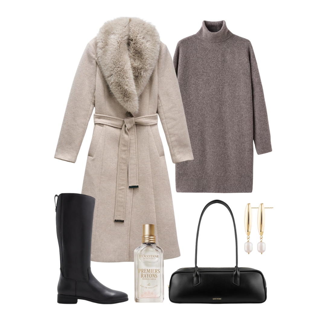 Bež kaput s krznenim ovratnikom slojevit preko sive pletene haljine-rolke i uparen s crnim čizmama do koljena stvara harmoničnu eleganciju koja izgleda iznad vremena. Neutralni tonovi djeluju nenametljivo skupo, dok biserne naušnice i strukturirana torba dodaju finalni touch rafinirane jednostavnosti. To je onaj minimalistički luksuz koji vlada poslovnim sastancima, a nakon posla i zimskim razgledom Adventa te svim prilikama koje zahtijevaju profinjenost.